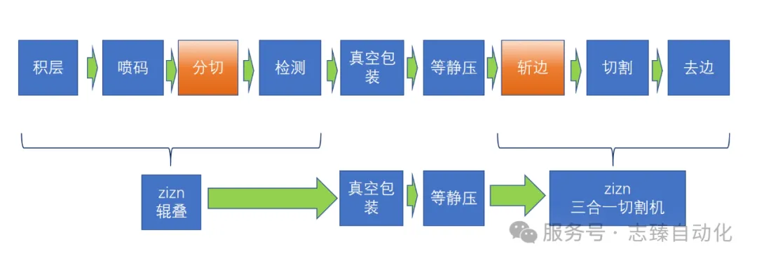 從積層工序開始,工藝形態從單層膜片堆疊為了一定厚度的巴塊,一直到切割后巴塊形態變為單顆Chip的顆粒形態。如下圖上部分所示為巴塊形態下傳統的工藝過程,志臻在其中關鍵的積層和切割工序上進行了優化,達到了下圖下半部分所示的工藝精簡。